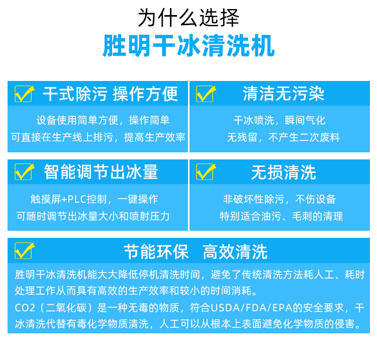 干冰粒在接觸時會升華(蒸發(fā)),清洗過程中沒有產(chǎn)生化學物質(zhì)、無毒、非磨料、非易燃、非導(dǎo)電;消除化學清潔的成本和危害,避免昂貴的環(huán)境清潔要求。