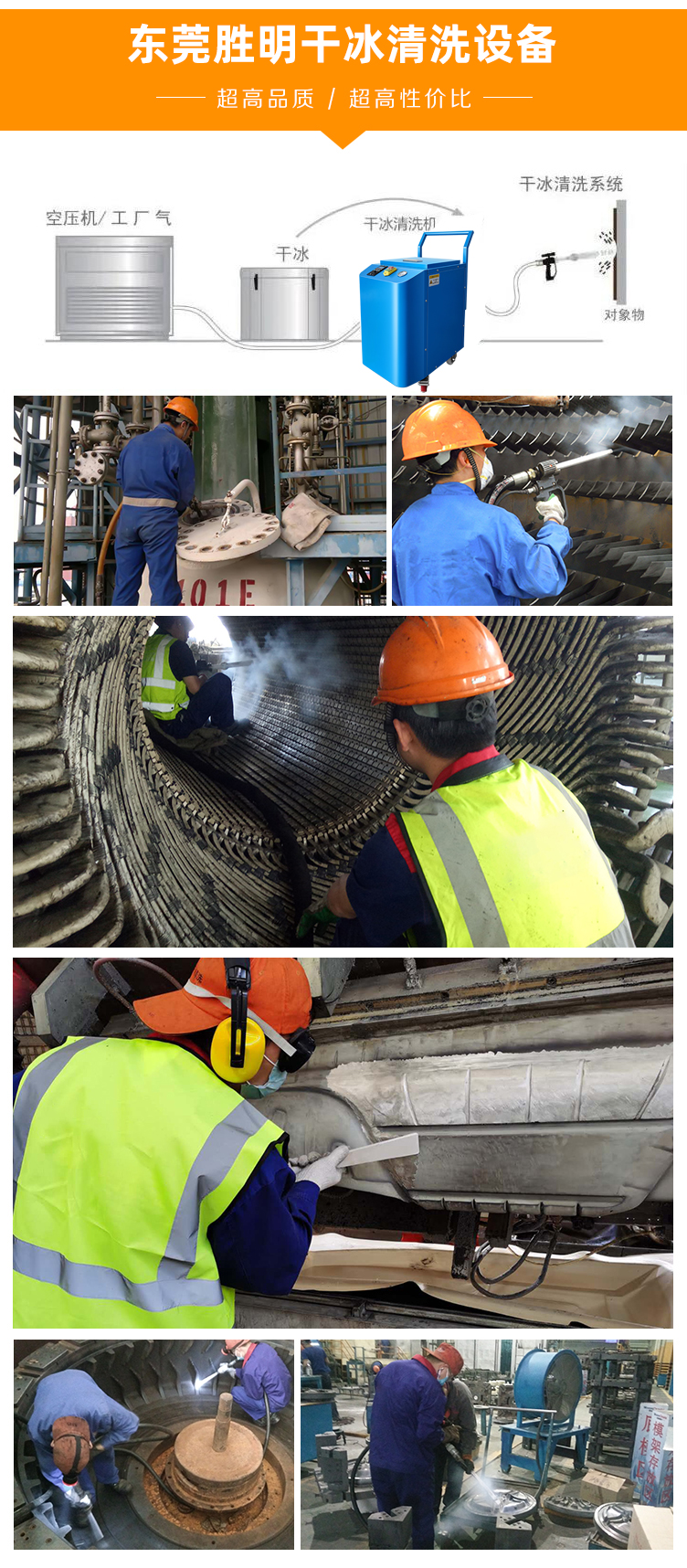 二氧化碳在-78.5°時凝固成固體,即干冰,干冰粉碎后分散在高壓空氣中,然后通過高速噴嘴加速后沖擊到被清潔的表面。高壓氣浪,再加上其中的干冰顆粒吹掃模具表面的殘留物。高聚物在低溫時變脆,并且變冷收縮,和模具分離。干冰顆粒在撞擊時升華,由固體變成氣體,膨脹了數(shù)百倍,進一步產(chǎn)生了沖擊力,從而達到快速、高效的清洗效果。